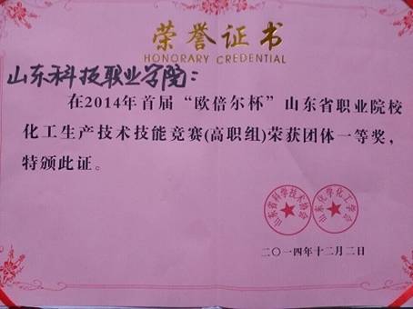 11月30日-12月2日,首届“欧贝尔杯”山东省职业院校化工生产技术技能大赛在青岛职业技术学院举行。本次大赛由山东省科学技术协会主办,山东化学化工协会和青岛职业技术学院共同承办。来自山东省内的20所中高职院校的60多名选手参加了本次比赛。比赛项目分为化工仿真操作和精馏操作两部分,其中化工仿真操作为个人项目,精馏为集体项目。经过三天的激烈比赛,我院参赛队荣获高职组团体一等奖;参赛选手董永杰、王朋飞获得个人全能一等奖;闫彬获得个人全能二等奖;任庚清和卜雪峰两位老师获得优秀指导老师称号。