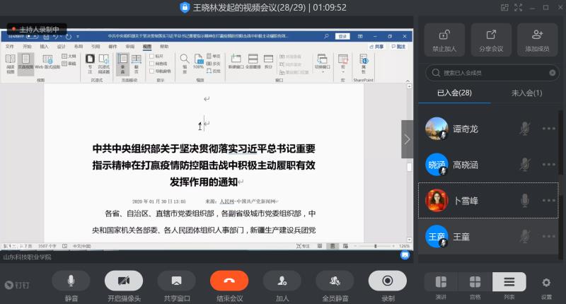 最后,卜雪峰同志带领大家集中学习了习近平总书记关于疫情防控工作的重要讲话和重要指示批示精神、山东省关于印发《关于进一步强化疫情防控工作的若干措施》的通知、赵乐际在十九届中央纪委四次全会上的工作报告、学院进一步用好“学习强国”学习平台为打赢疫情防控阻击战提供有力舆论支持的通知,深刻了解了党员在防疫工作中坚定信心、凝心聚力、发挥先锋模范作用的重要性,号召大家继续担当作为不松劲。