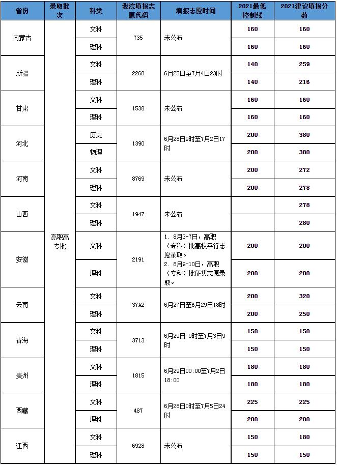 备注:考生根据往年录取情况,尤其是内蒙古、贵州、安徽、西藏、甘肃考生达到各自省份专科资格线即可大胆填报。建议第一志愿填报我院,提高录取率。