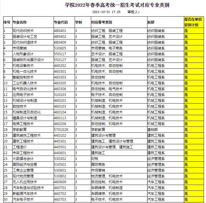 学院2022年春季高考统一招生考试对应专业类别