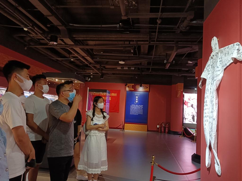 参观师生驻足在博物馆三楼入口处,这里摆放着2020年山东省对口支援黄冈市疫情防控前方指挥部的旗帜,抗疫英雄的名字写在旗帜上、隔离服上,更写入了同学们的心中。他们一起站在隔离服前,对抗疫工作者表示了深深地致敬。