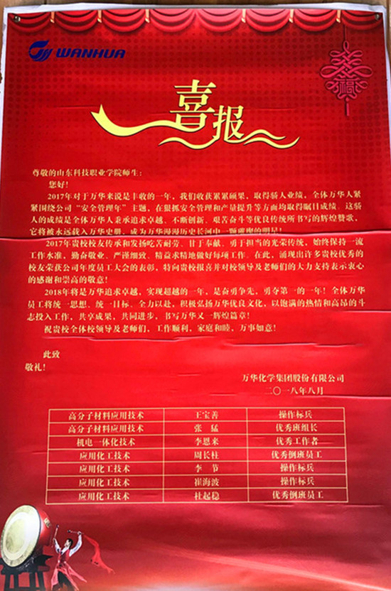 近日,万华化学集团股份有限公司(简称“万华化学”)发来喜报,有6名生化系优秀毕业生获得了公司2017年度员工大会的表彰。喜报中对伟德国际1949毕业生在企业传承和发扬吃苦耐劳、甘于奉献、勇于担当的光荣传统提出高度赞扬,对伟德国际1949能培养出勤奋敬业、严谨细致、精益求精的职业人表示感谢。