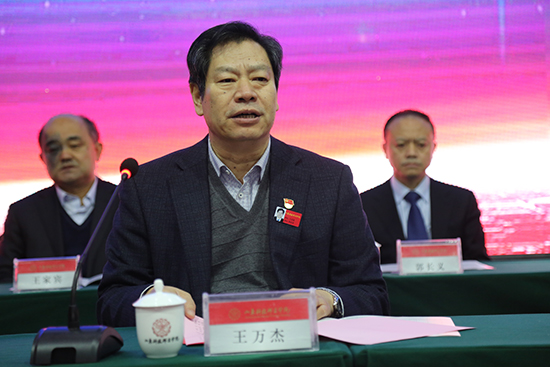王万杰在会上致辞。他向长期以来支持学院改革发展的各级领导部门,各方行业企业表示感谢。他讲到,优质高职院校建设的成功启动和山东省智能制造职教集团的成功建立是学院发展历程的新起点,必将进一步增强学院服务山东和区域经济社会发展的能力,为山东和区域经济的发展提供更大的人才和智力支持。学院将深入学习宣传贯彻党的十九大精神,使学院成为推动山东现代制造强省建设的高素质技术技能人才培养的重要基地。学院还将以建设优质高职院校为统领,全面增强服务区域经济和山东经济社会发展能力做出积极贡献。